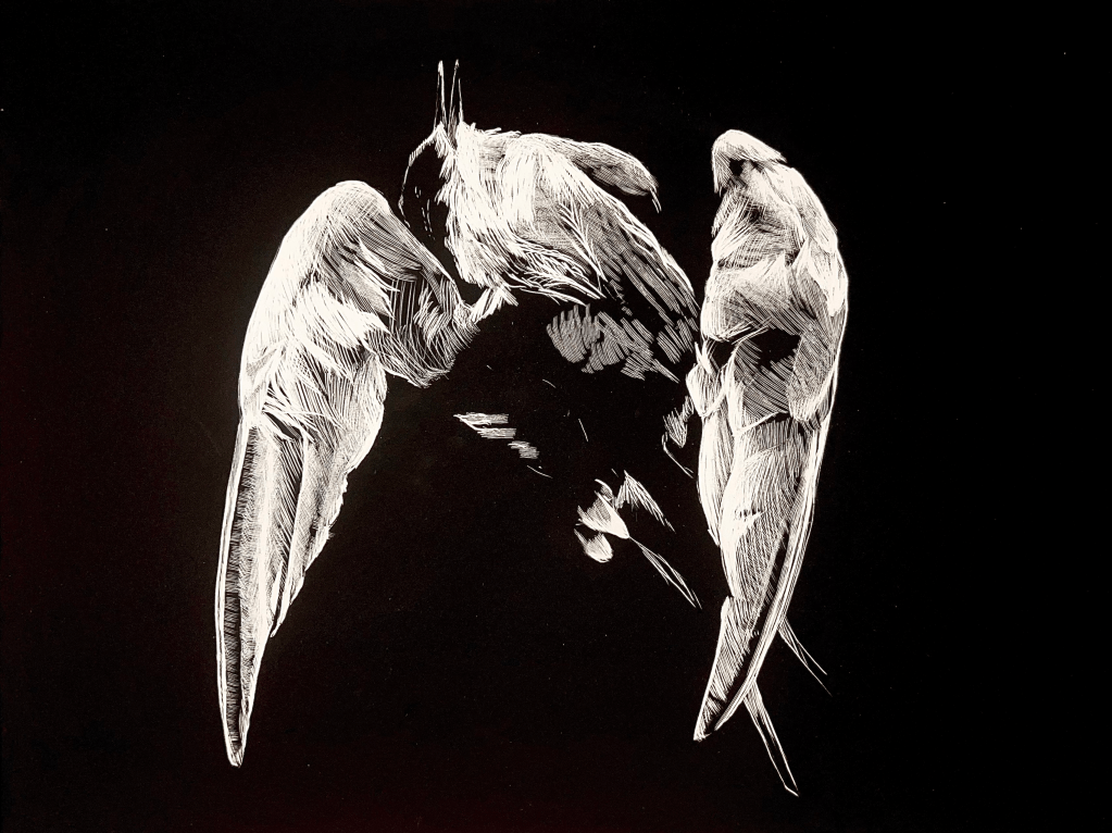 Artist Statement: “Tern” is part of a series of works depicting dead birds found on the beaches of Cape Cod, MA. Its chief aesthetic concern lies in capturing the beauty of the bird’s pose in death—its bent wings and cocked head suggest potential dynamism, which is foiled and frozen by the oppressive black of the scratch board’s ink.