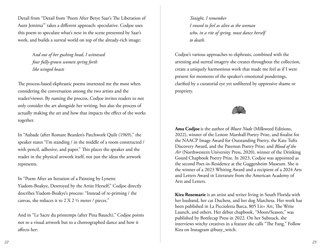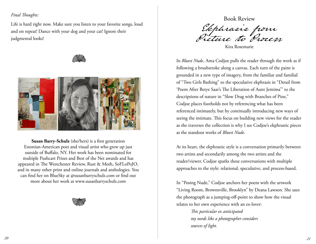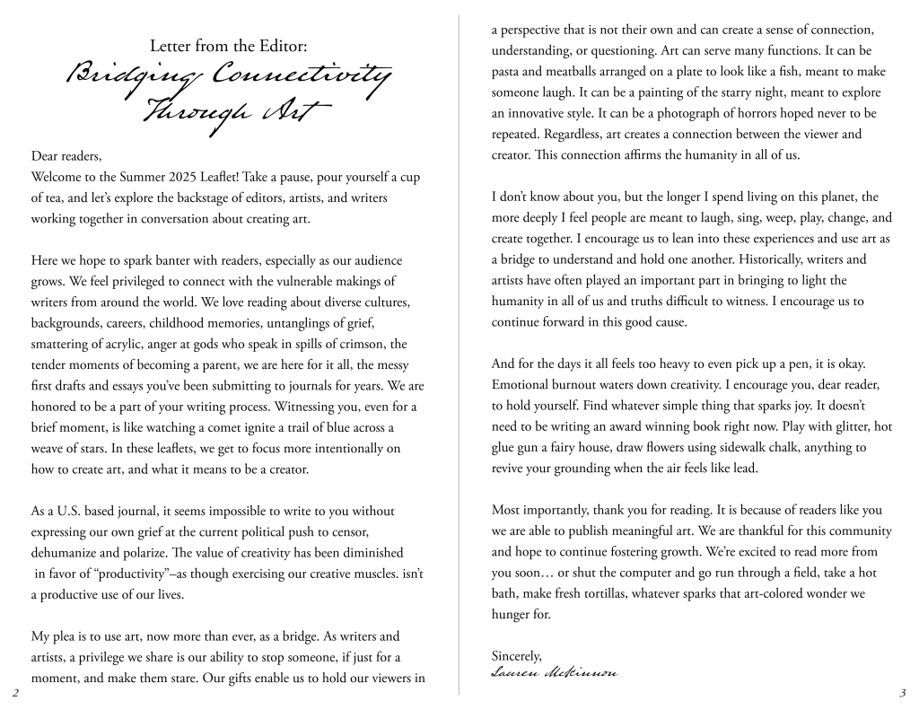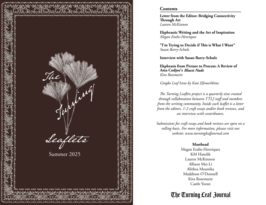 The Summer 2025 leaflet explores intersections between visual art and creative writing by studying ekphrastic writing and learning from artists. The editorial letter suggests the value of engaging with artwork, the craft essay explains and provides starting points for ekphrastic writing, and a book review of Ama Codjoe’s Bluest Nude reveals a master-class example of ekphrastic writing. At the center of the leaflet is an interview with Volume 1.2 contributor Susan Barry-Schulz, who gives us a closer perspective on what it’s like to be an artist and a poet, and how to two go hand-in-hand.