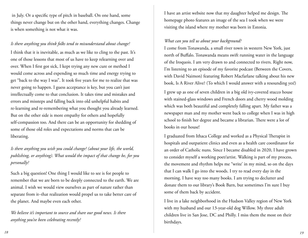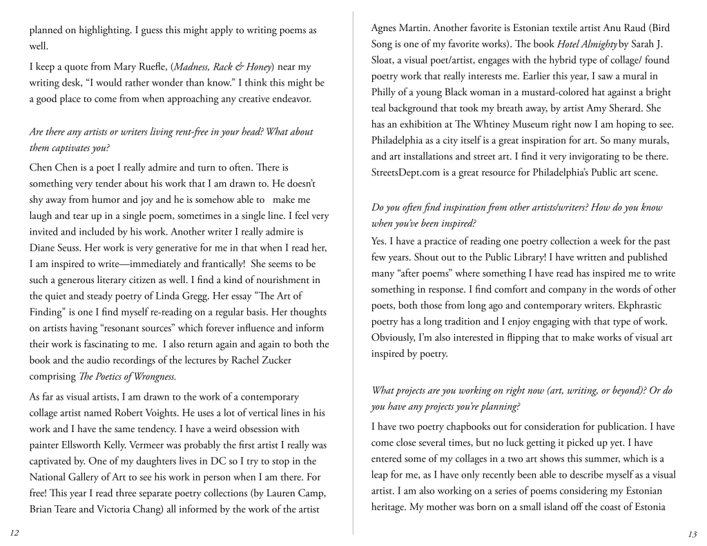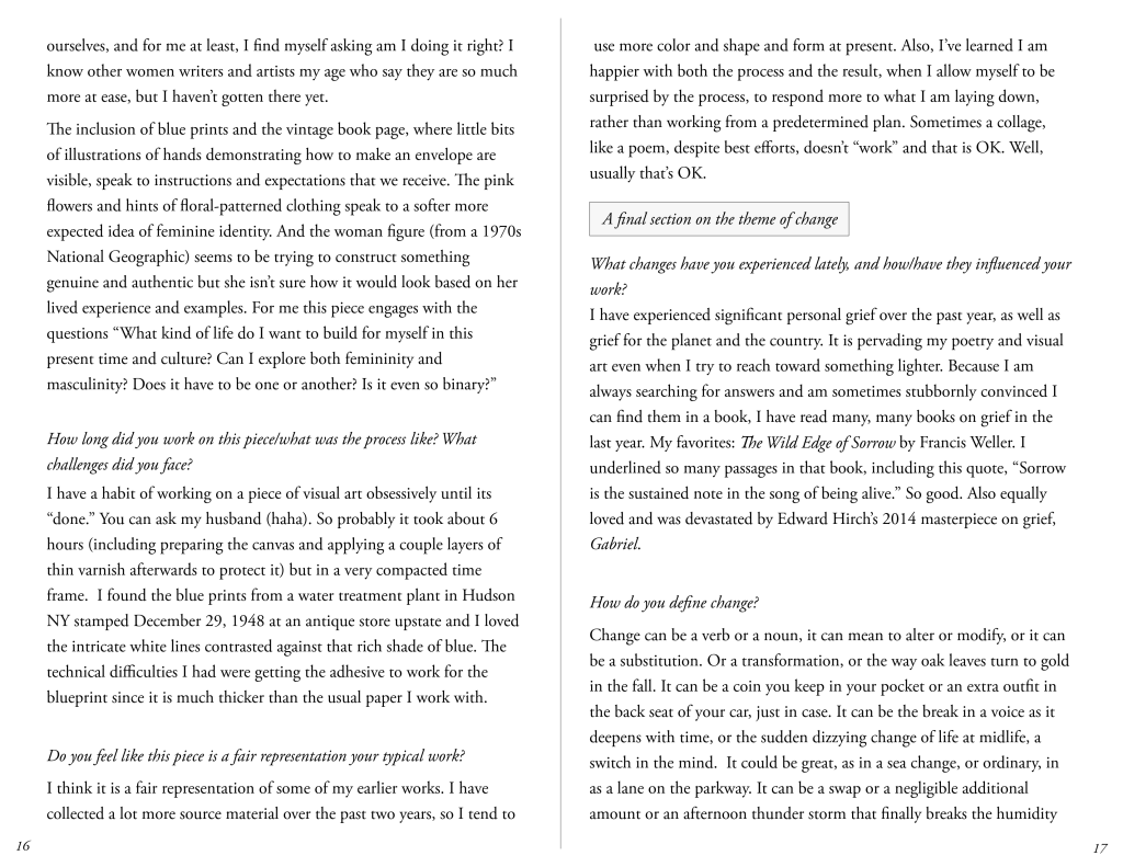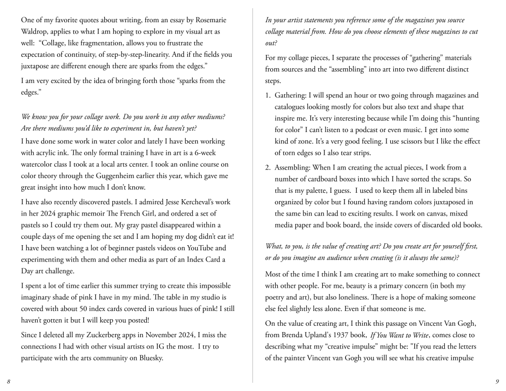 The Summer 2025 leaflet explores intersections between visual art and creative writing by studying ekphrastic writing and learning from artists. The editorial letter suggests the value of engaging with artwork, the craft essay explains and provides starting points for ekphrastic writing, and a book review of Ama Codjoe’s Bluest Nude reveals a master-class example of ekphrastic writing. At the center of the leaflet is an interview with Volume 1.2 contributor Susan Barry-Schulz, who gives us a closer perspective on what it’s like to be an artist and a poet, and how to two go hand-in-hand.