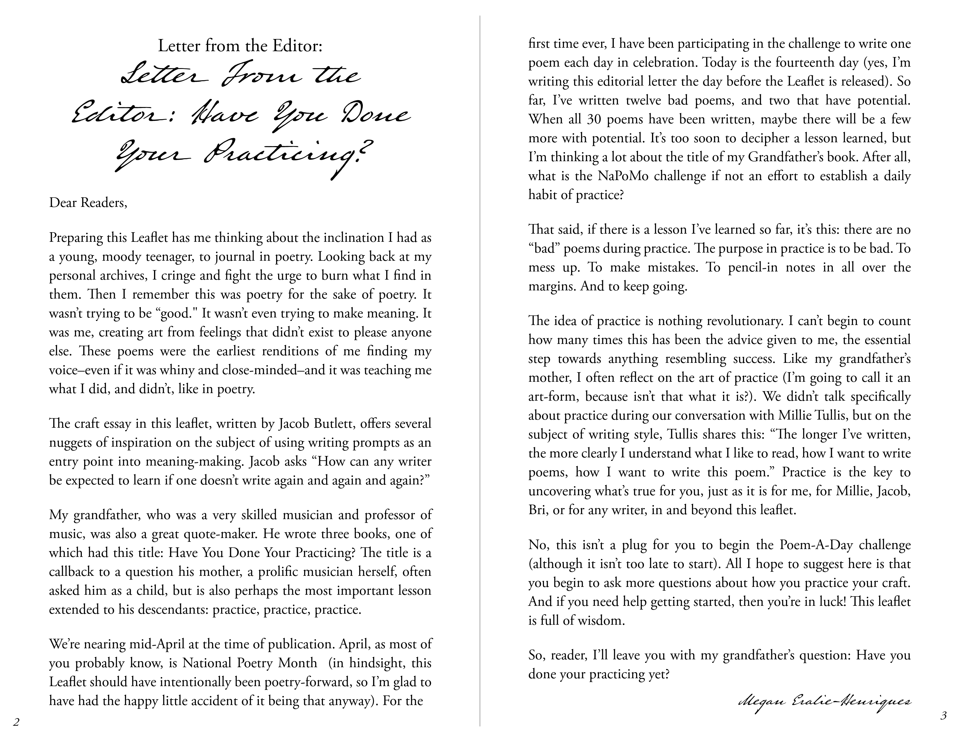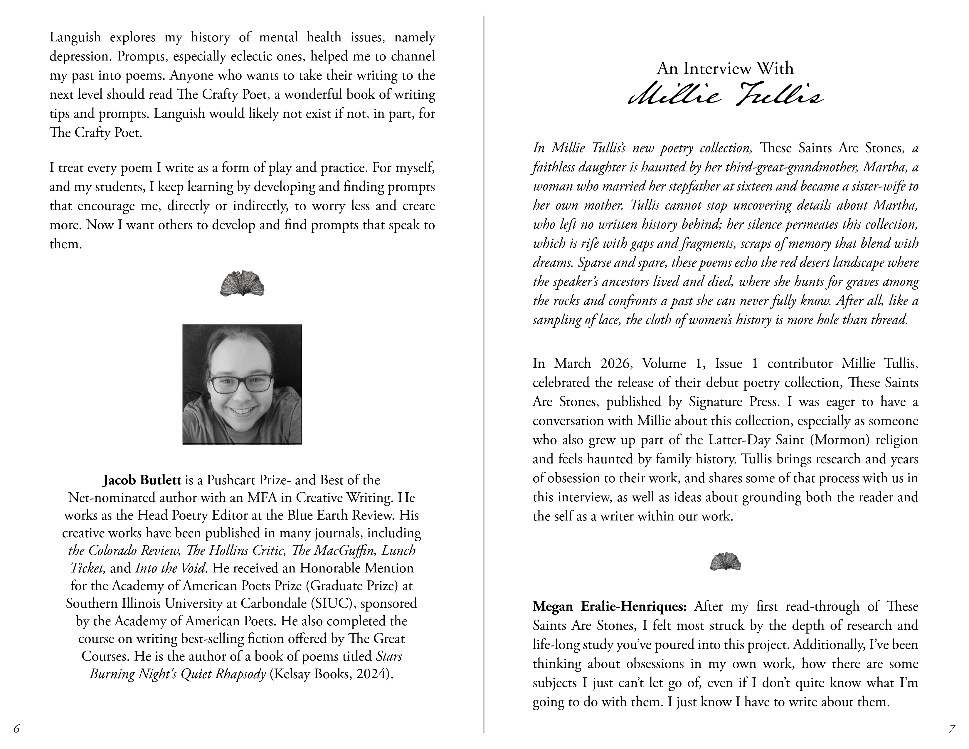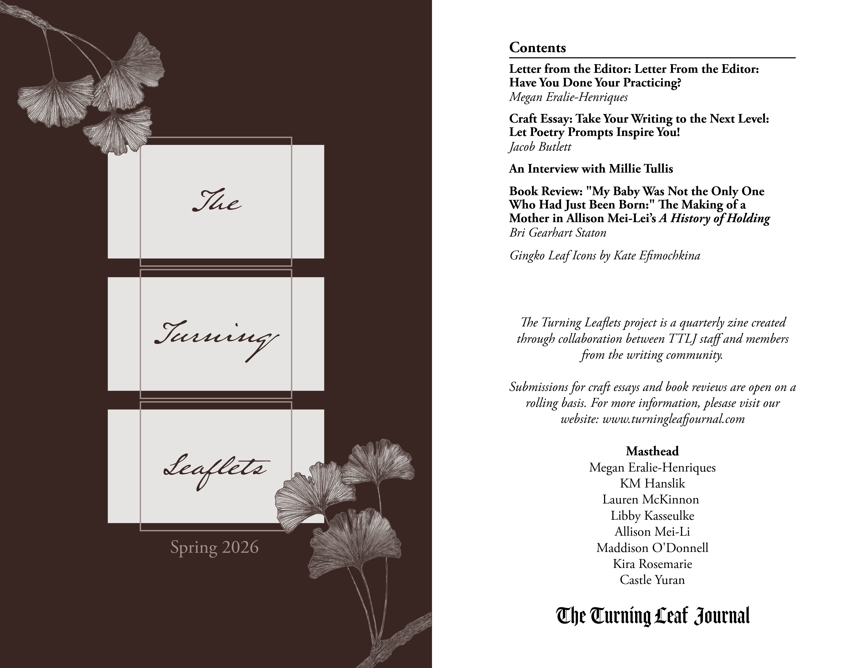 The Spring 2026 edition of “The Turning Leaflets” is accidentally, but excitingly so, poetry-forward. Megan Eralie-Henriques’s editorial letter reflects on the National Poetry Month challenge to write a poem a day and the value of practice. A craft essay from Jacob Butlett, Volume 1, issue 2 contributor, investigates the power of using writing prompts to spark creativity and meaning-making in poetry. Then, an interview with Millie Tullis in celebration of their debut poetry collection, These Saints Are Stones, where Millie shares a little about the process of bringing research and personal history to their work, and how to ground both the reader and the self as writer within that work. Finally, Bri Gearhart Staton’s review of TTLJ’s reader Allison Mei-Li’s A History of Holding: Poems on Motherhood closes out the leaflet.