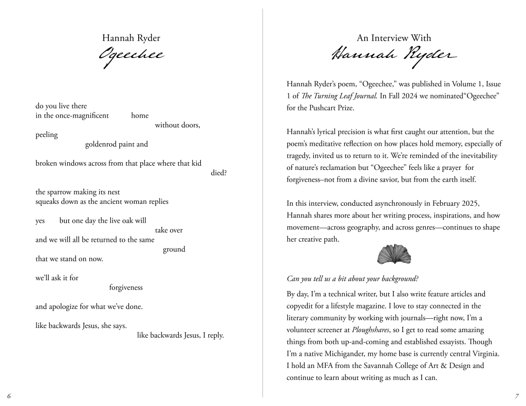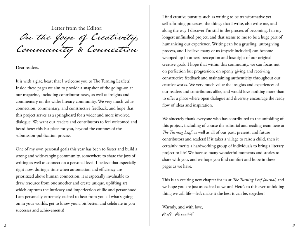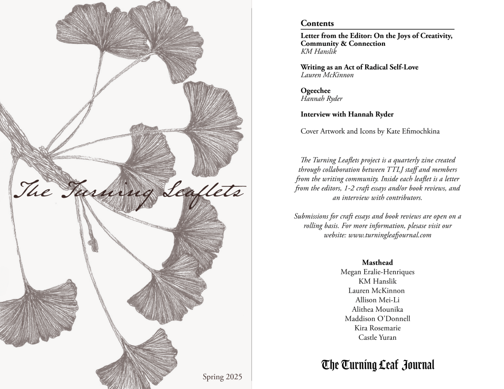 In our first Leaflet, the editors took over and produced some incredible work! Inside you’ll find a letter from K.M., and a craft essay from Lauren. We also got to interview with Vol 1.1 contributor Hannah Ryder.